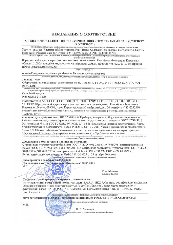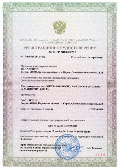В 2008 году после проведения сертификационных испытаний на соответствие норм и Директив Евросоюза получен Европейский сертификат на медицинский озонатор.